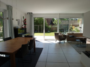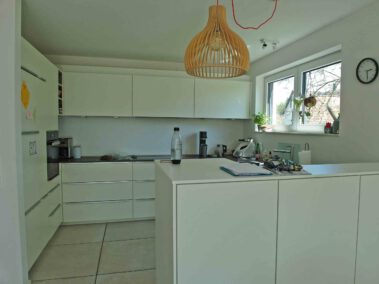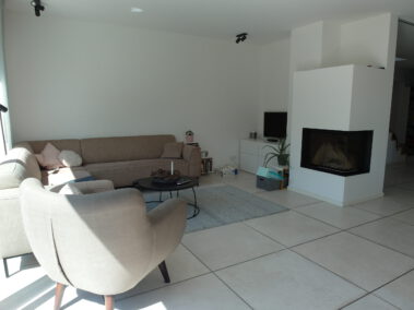 Das angebotene Architektenhaus ist sehr geschmackvoll und großzügig konzipiert und ideal für eine Familie mit 2 Kindern geeignet. Das Erdgeschoss unterteilt sich in einen großen Wohn-Essbereich mit offener Küche, ein Arbeits-oder Gästezimmer, eine geräumige Diele und ein Gästebad mit WC und Dusche. Alle Böden sind einheitlich mit großformatigen hellen Fliesen ausgestattet, die die Großzügigkeit der Räume unterstreichen. Die offene Küche ist geschickt optisch abgeteilt und beeindruckt durch schlichte weiße Eleganz. Durch die großen bodentiefen Fensterflächen ist der gesamte Wohn-Essbereich sehr hell und einladend und bietet einen wunderschönen Blick auf die Terrasse und in den Garten. Im Wohnbereich sorgt ein moderner Kaminofen auch an Winterabenden für Gemütlichkeit.