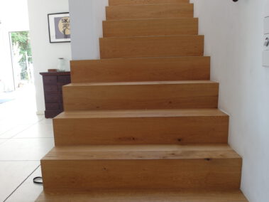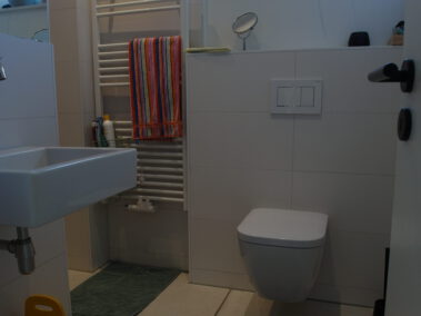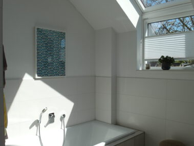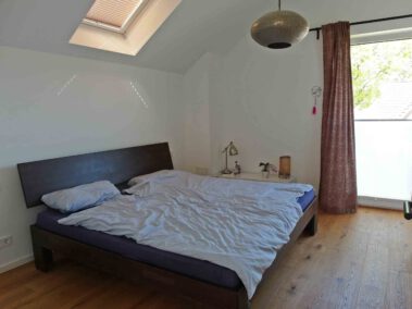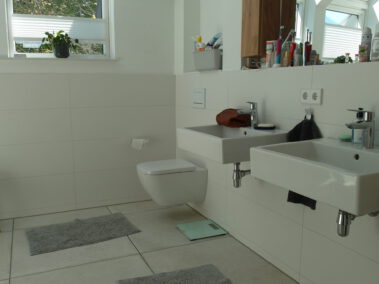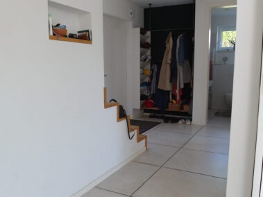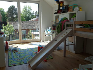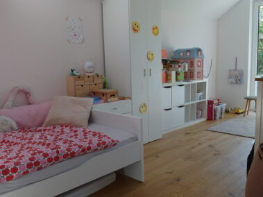 Ins Obergeschoss führt eine Treppe mit modernem Designerbelag in Eichenoptik, der sich in allen Wohnräumen befindet und geschickt mit den weißen Wänden kontrastiert. In diesem Bereich befinden sich zwei Kinderzimmer, ein großes Badezimmer mit Dusch – und Wannenbad, ein breiter Flur sowie ein Schlafzimmer mit angegliedertem Ankleidebereich.