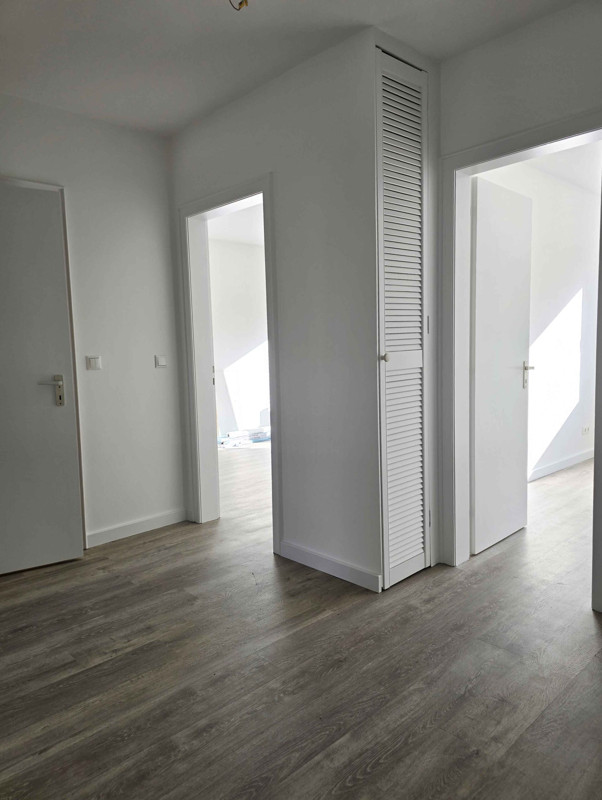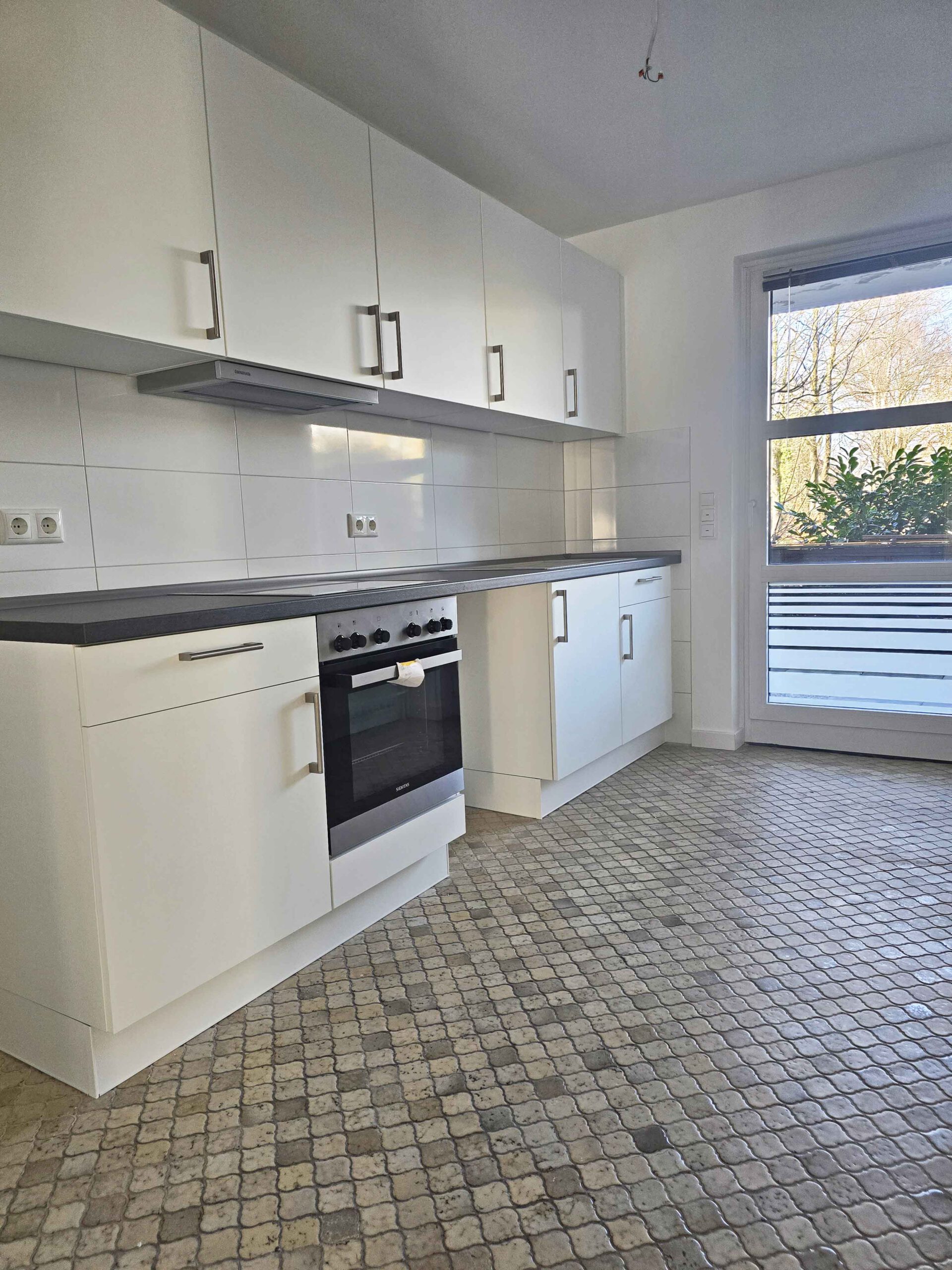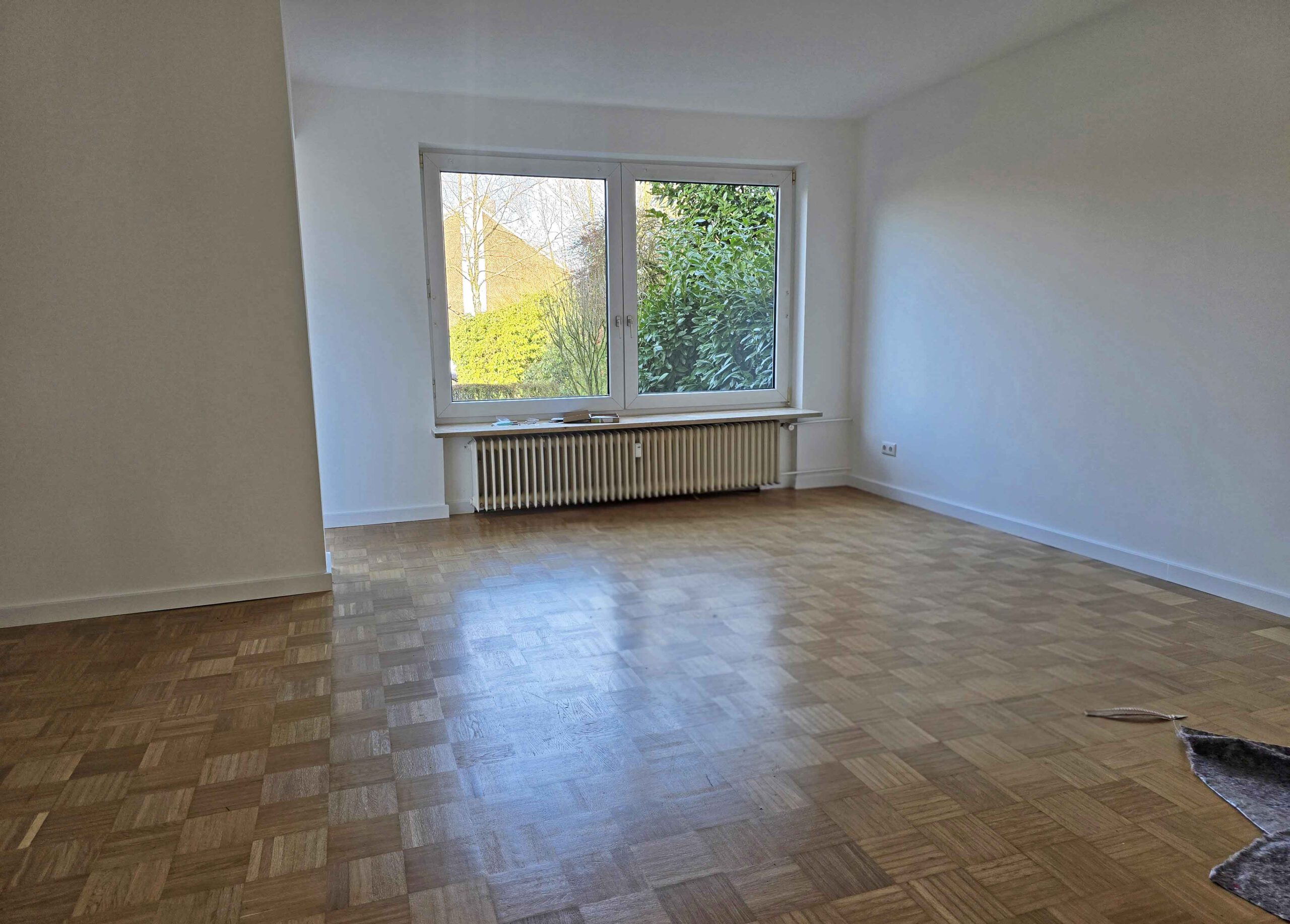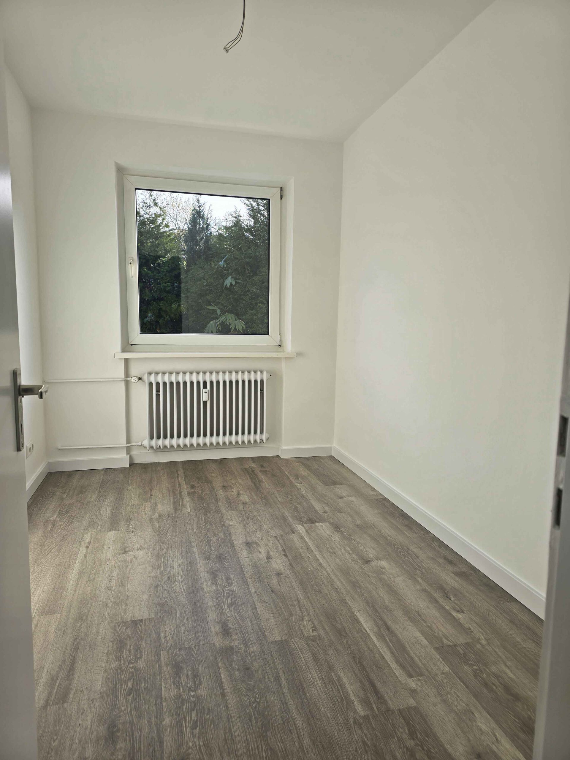 Der sehr wohnlich gestaltete Grundriss lässt selbst im Dielenbereich ausreichend Platz für eine Möblierung, von hier sind alle Zimmer zu erreichen. Die Küche ist mit einer neuen, modernen Einbauküche ausgestattet, das Badezimmer mit bodengleicher Dusche ist in Weiß/Anthrazit gehalten und verfügt über ein Fenster. Vom Wohnzimmer aus gelangt man auf die großzügige überdachte Terrasse. Durch die Überdachung ist hier im Sommer ein gemütlicher Sitzplatz vorhanden, der auch für Pflanzen ausreichend Platz bietet. Das Wohnzimmer ist mit Parkettboden ausgestattet, im Schlafzimmer, Kinderzimmer und Flur liegt moderner Vinylboden in Dielenoptik.