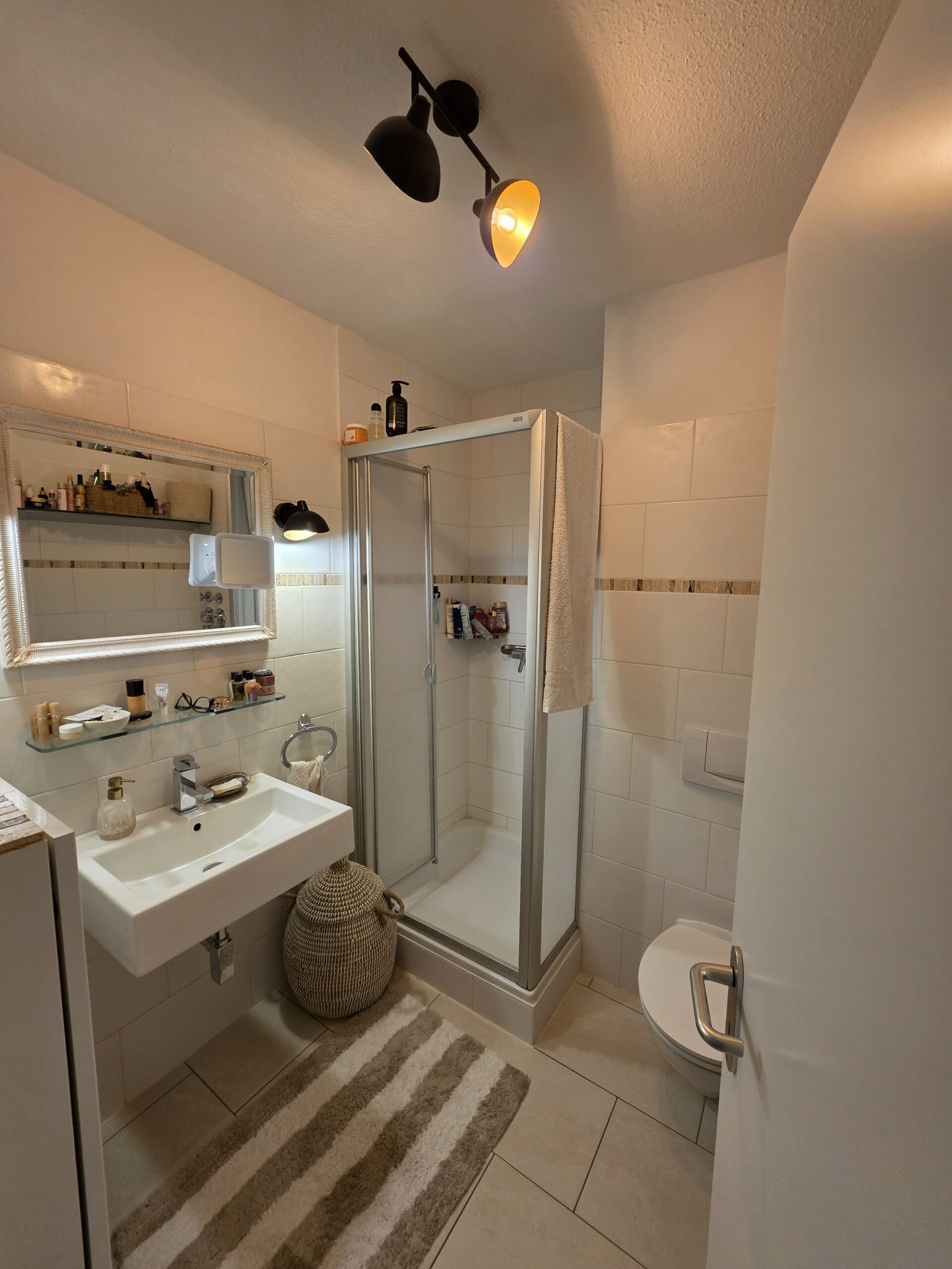 Diese großzügig geschnittene 2-Zimmer- Wohnung befindet sich im Obergeschoss einer gepflegten Doppelhaushälfte, die Mitte der 90-er Jahre erbaut wurde. Die ruhige Lage und der großzügige Zuschnitt der Zimmer zeichnen diese Wohnung aus. Das Wohnzimmer (ca. 33 m² Wohnfl.) lässt sich ideal in einen Ess- und Wohnbereich aufteilen und wirkt durch den warmen Farbton des Parkettbodens sehr einladend und freundlich. Die Küche ist mit einer hellen Einbauküche mit viel Platz für Geschirr und Kochutensilien ausgestattet. Das innenliegende Duschbad ist in Weiß gehalten. Die Fußböden im Flur und in der Küche sind einheitlich gefliest. Im Schlafzimmer befindet sich Teppichboden. Zur Wohnung gehören der Dachboden (Zugang über eine Einschubtreppe), eine kleine Terrassenfläche und ein PKW-Stellplatz.