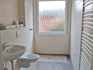 Alle Fenster der Wohnung verfügen über Außenrolläden. Zur Wohnung gehören ein Kellerraum und ein PKW-Stellplatz (Miete 30,– €/Monat). Der Hausgemeinschaft steht im Keller ein Waschkeller mit Münzwaschmaschine und ein Trockenraum zur Verfügung.